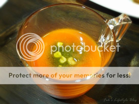 烤燈籠椒蓄茄湯, 上面加了點烤過的粟米。因為是玻璃杯的閞係?! 大家都有點不太肯定是什麼, 非常有趣。