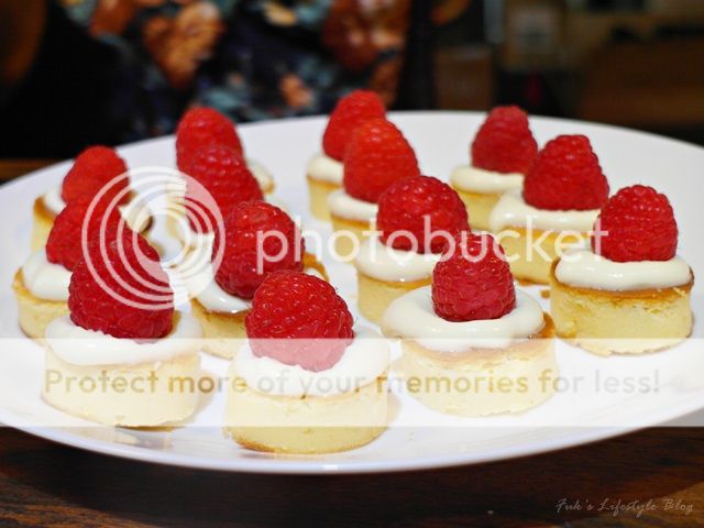 在晚餐結束之前, 當然少不得甜品。這次為大家一共準備了兩款甜品, 首先是做成一口大小的芝士蛋糕。